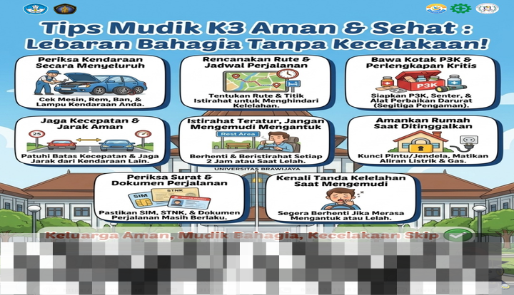Menjelang musim mudik Lebaran, penting bagi kita untuk memprioritaskan keselamatan dan kesehatan dalam perjalanan. Universitas Brawijaya (UB), melalui Divisi Keselamatan dan Kesehatan Kerja (K3), memberikan imbauan kepada masyarakat agar menerapkan prinsip-prinsip keselamatan dan kesehatan selama perjalanan mudik. Ini merupakan langkah strategis untuk memastikan bahwa perjalanan ke kampung halaman tidak hanya berlangsung dengan nyaman, tetapi juga aman dan sehat.